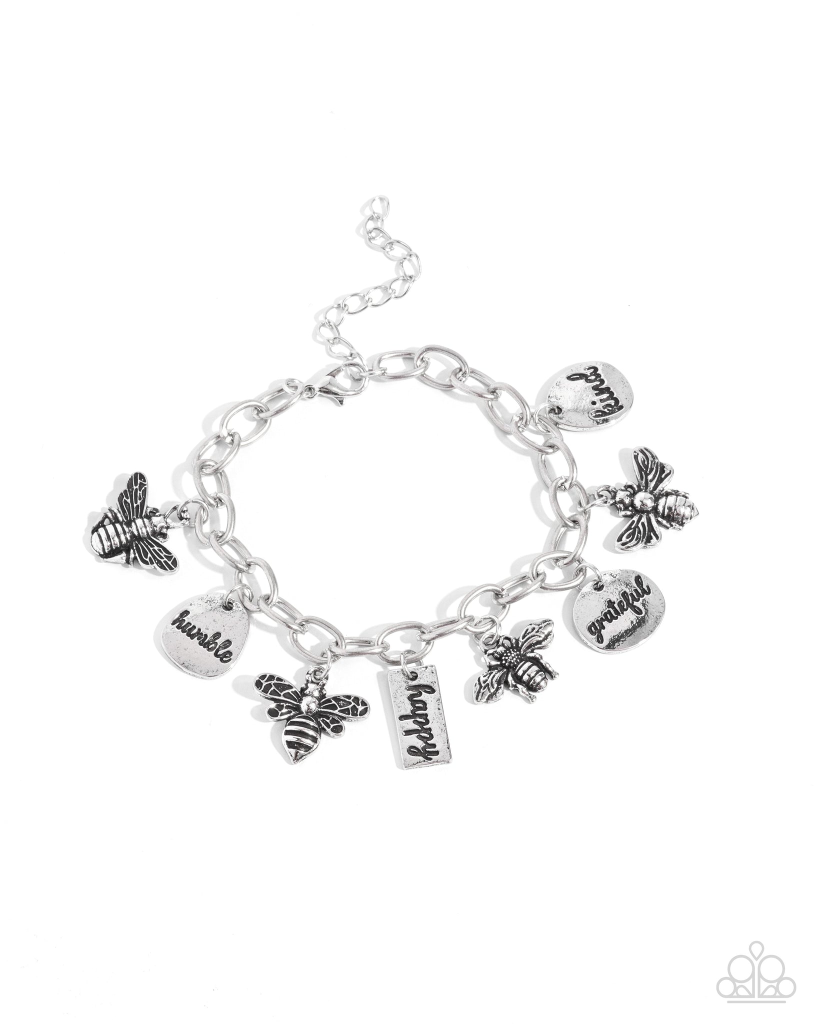 Swaying along a silver cable chain, a collection of compassionate and whimsical silver charms including detailed bees and pendants with the words "humble," "happy," "grateful," and "kind" create an iconic, inspirational design along the wrist. Features an adjustable clasp closure.