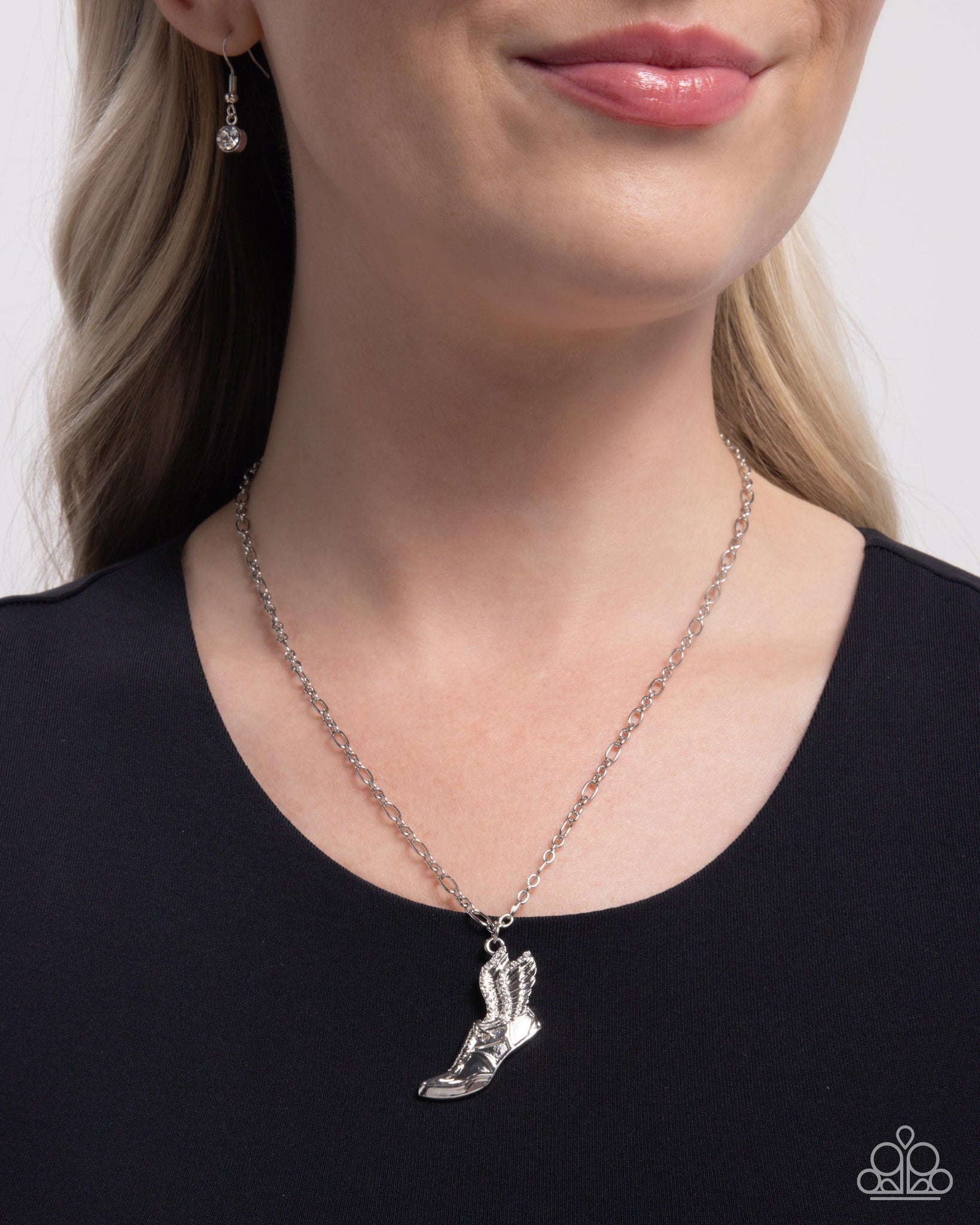 Lining the wings of a track spike shoe pendant, a collection of glistening white rhinestones stands out below the neckline from an abstract silver chain for a radiant runner-inspired display. Features an adjustable clasp closure.