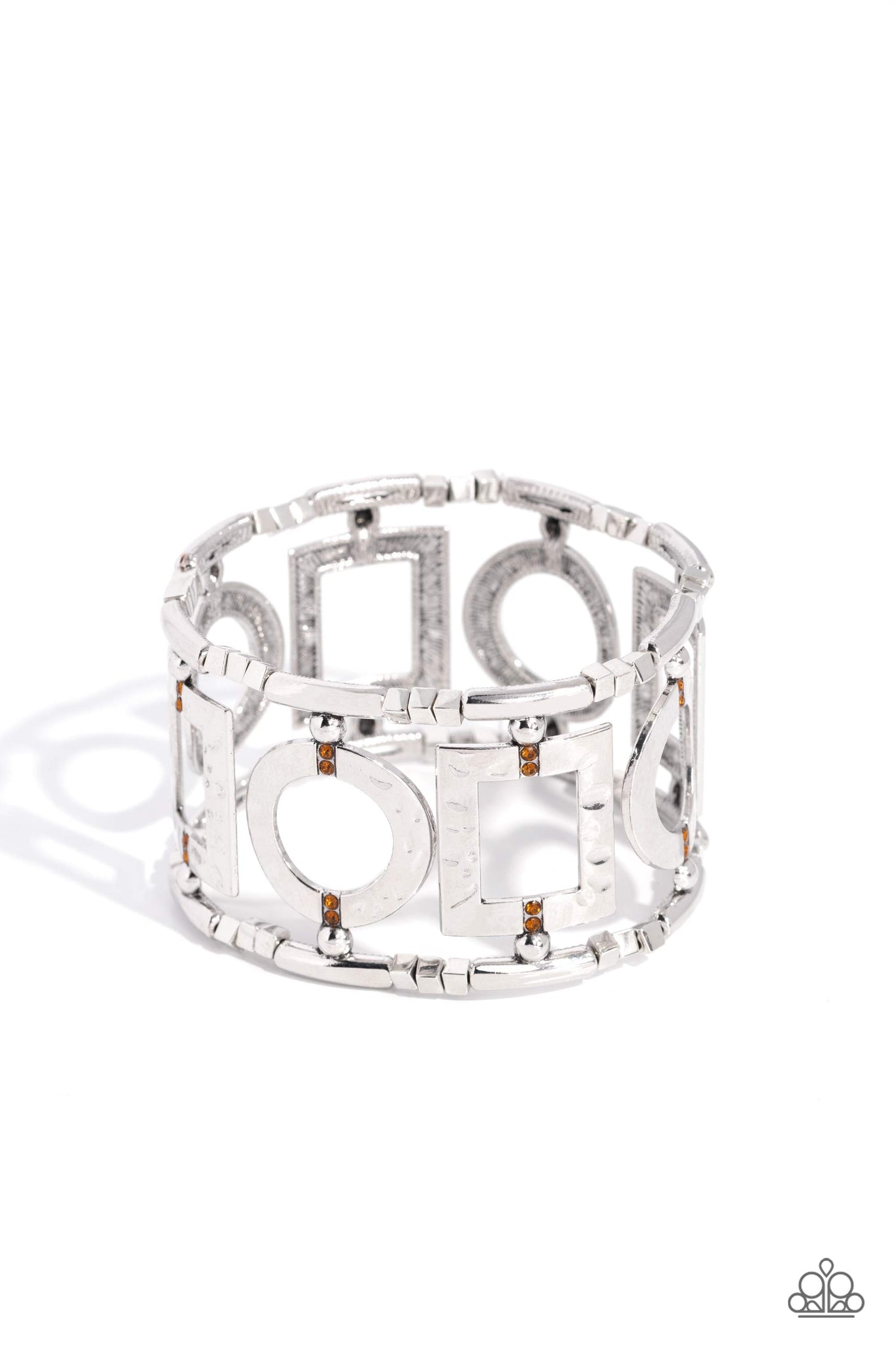 Dotted with dainty topaz rhinestones, an airy collection of hammered circular and rectangular frames glides along stretchy bands around the wrist. The geometric frames are separated by trios of dainty silver cube beads, adding extra edge to the textured display.