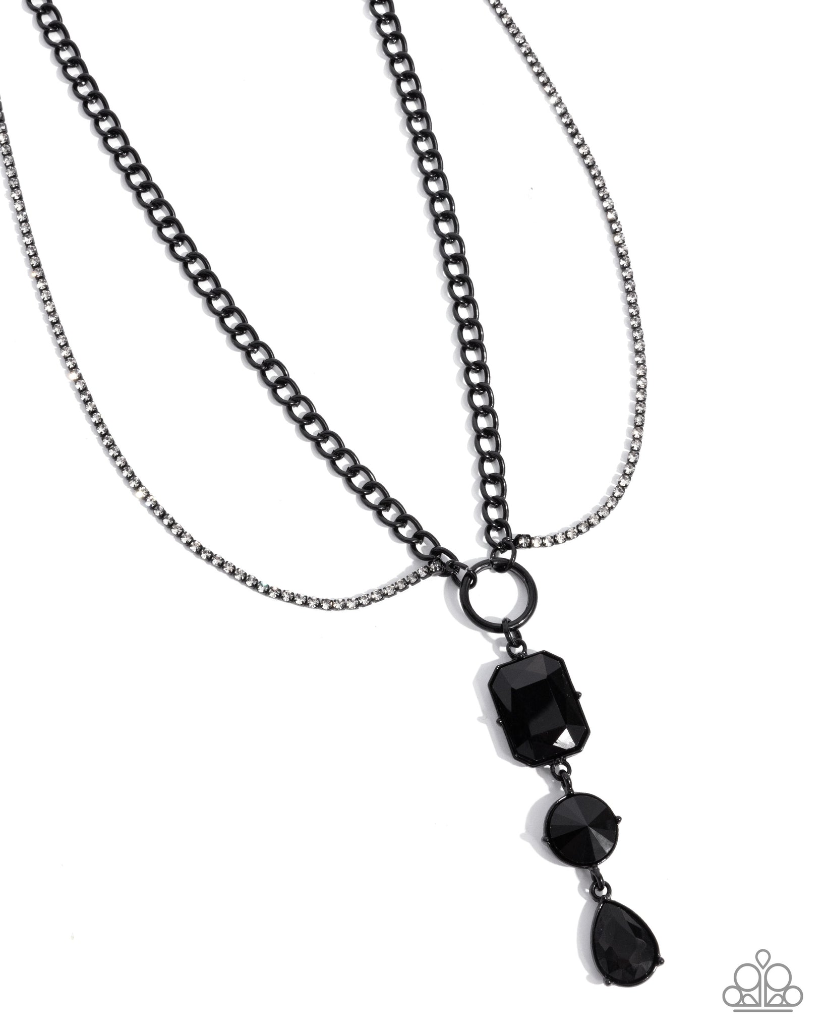 Pressed in black-painted square fittings, a collection of white rhinestones joins a black-painted curb chain, connecting to a black-painted ring in the center of the display for a mismatched, mesmerizing look. Bold, faceted emerald-cut, round, and teardrop gems in black hues give way from the black-painted ring for an edgy pop of color below the neckline. Features an adjustable clasp closure.