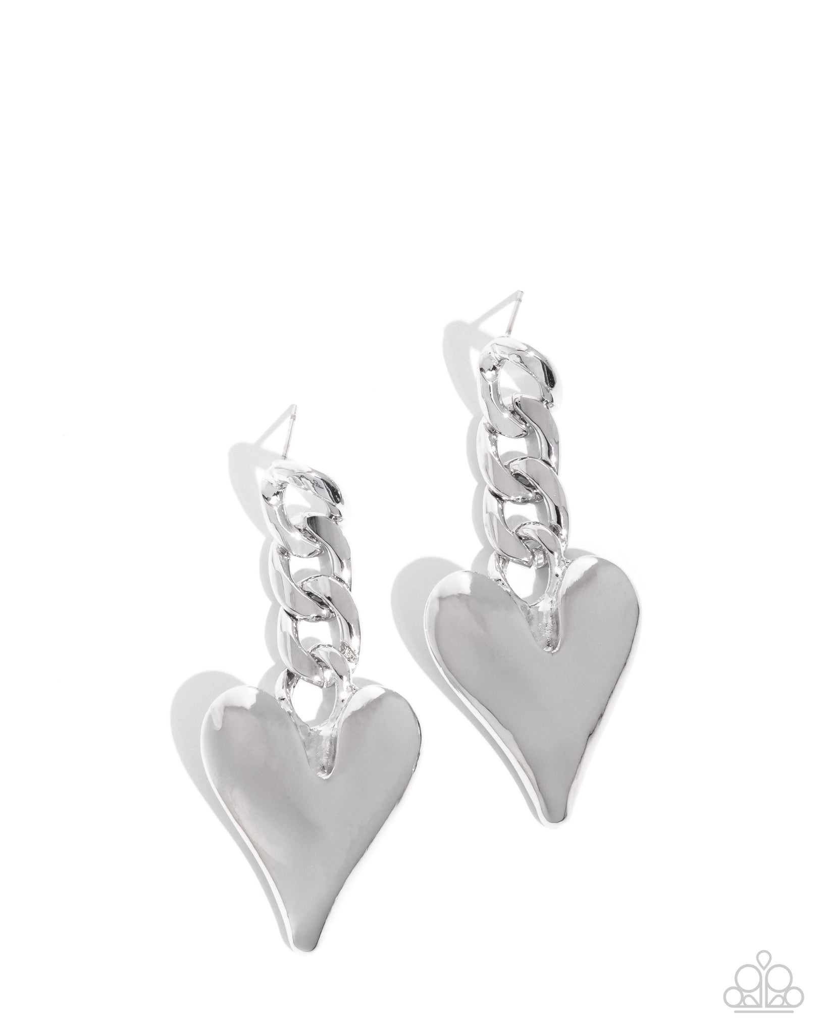 A trio of glistening silver curb chain links gives way to a slightly pinched silver heart for a flashy feminine lure. Earring attaches to a standard post fitting.