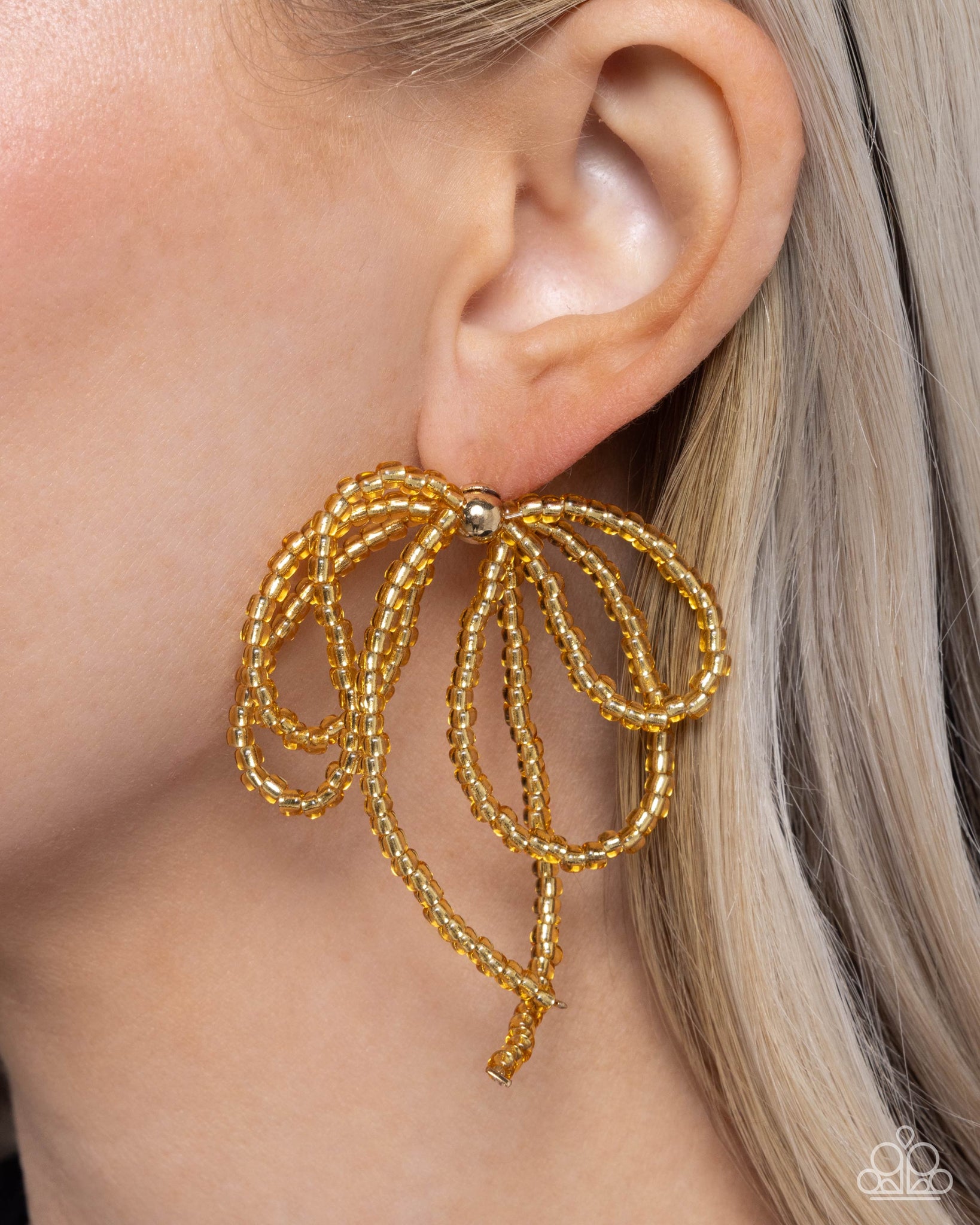Extending from a solitaire gold post, transparent gold seed beads loop and curl below the ear into a refined bow for a feminine look. Earring attaches to a standard post fitting.