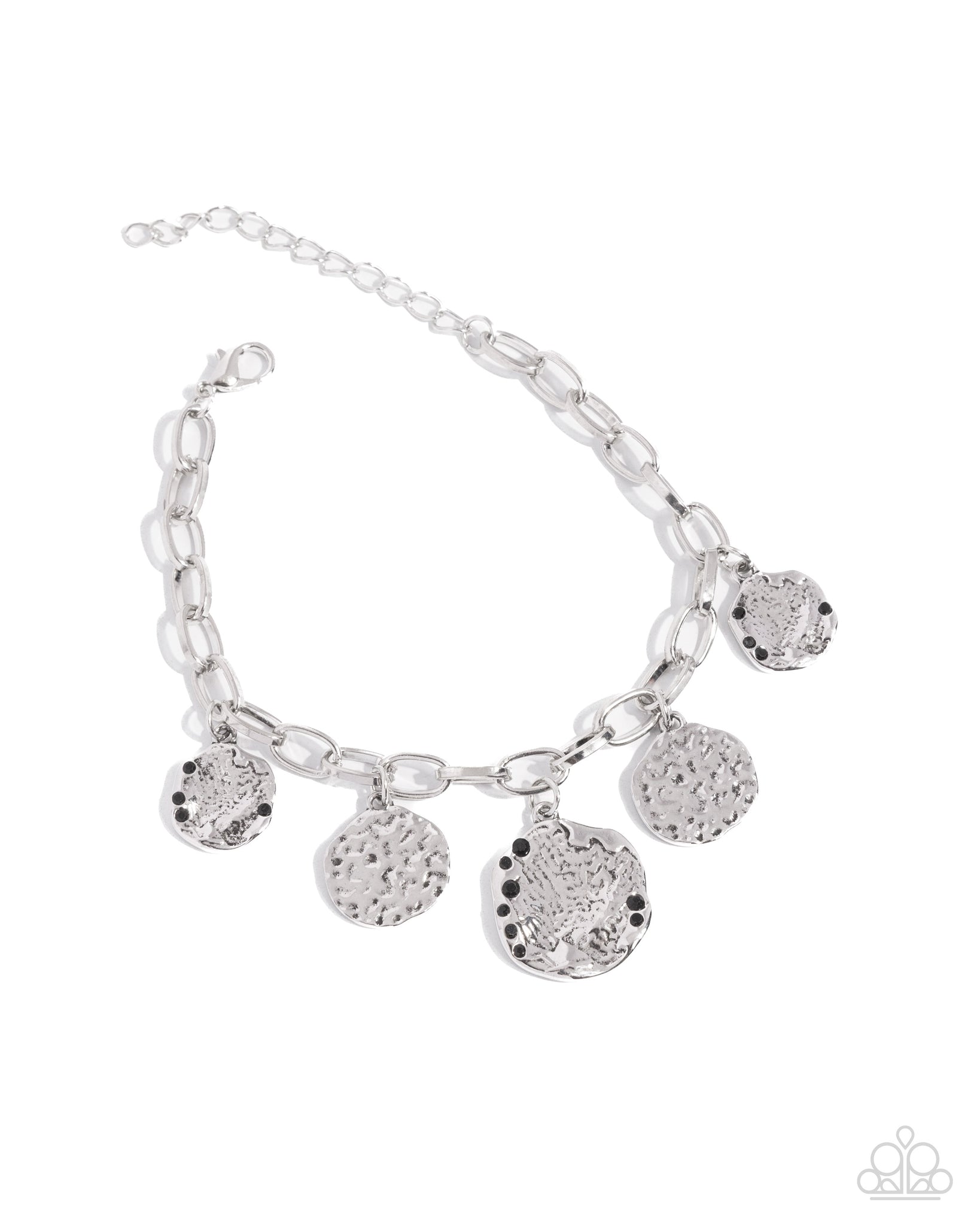 Featuring antiqued hammered detail and black rhinestone embellishment, various silver discs dangle along a silver paperclip chain along the wrist for a wildly whimsical look. Features an adjustable clasp closure.